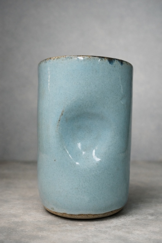 Ten wyjątkowy kubek został uformowany ręcznie, dzięki czemu posiada charakterystyczne, delikatnie nieregularne kształty oraz ergonomiczne wgłębienie, które idealnie mieści się pod palcami. Pokryty błękitnym szkliwem o lekko przygaszonej, naturalnej tonacji, prezentuje się spokojnie i minimalistycznie – idealnie wpisuje się zarówno w nowoczesne, jak i bardziej rustykalne wnętrza.
